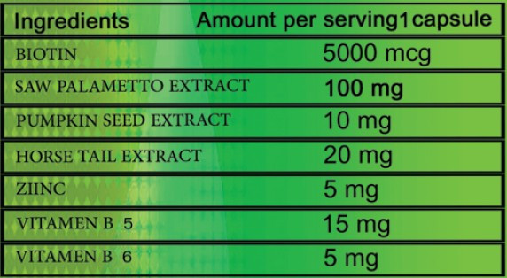 البيوتين, مستخلص عشبة الساوبالميتو, مستخلص بذور اليقطين, مستخلص ذيل الحصان, زنك, فيتامين ب5, فيتامين ب6