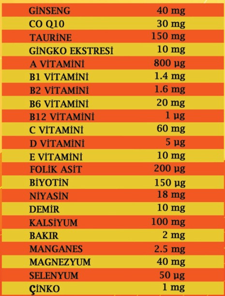 الفيتامينات: أ, ب1, ب2, ب6, ب12, س, د, ي, فوليك أسيد, بيوتين, نياسين.